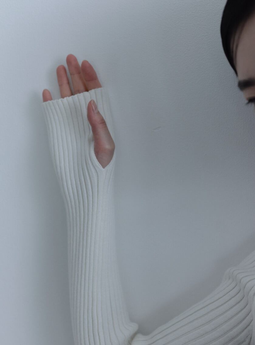 袖丈は長めにとってあり手元に施したフィンガーホールに指を入れ