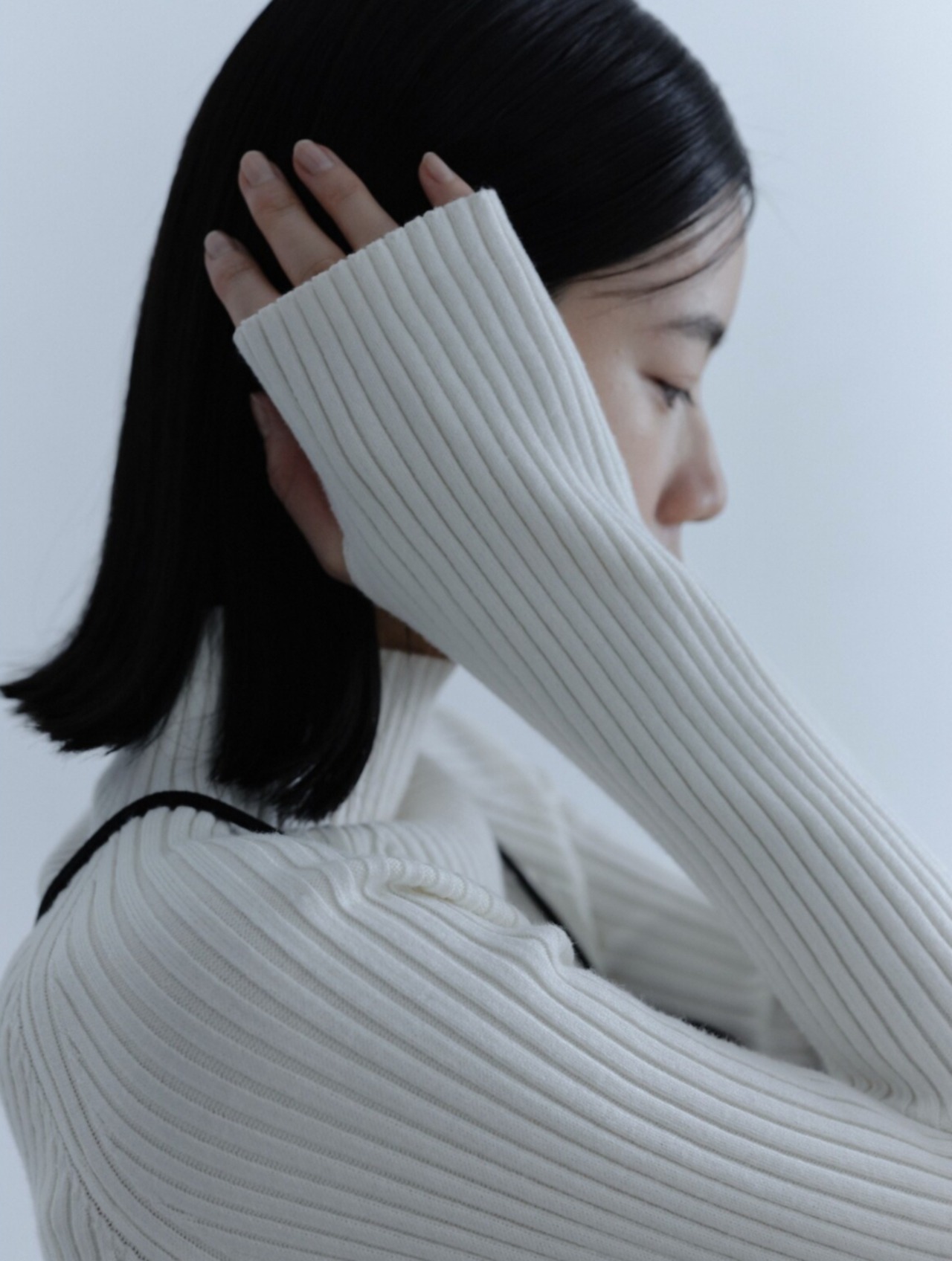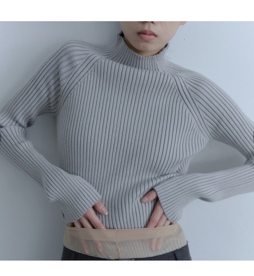メリハリのある中肉厚のハイネックリブニットトップス。