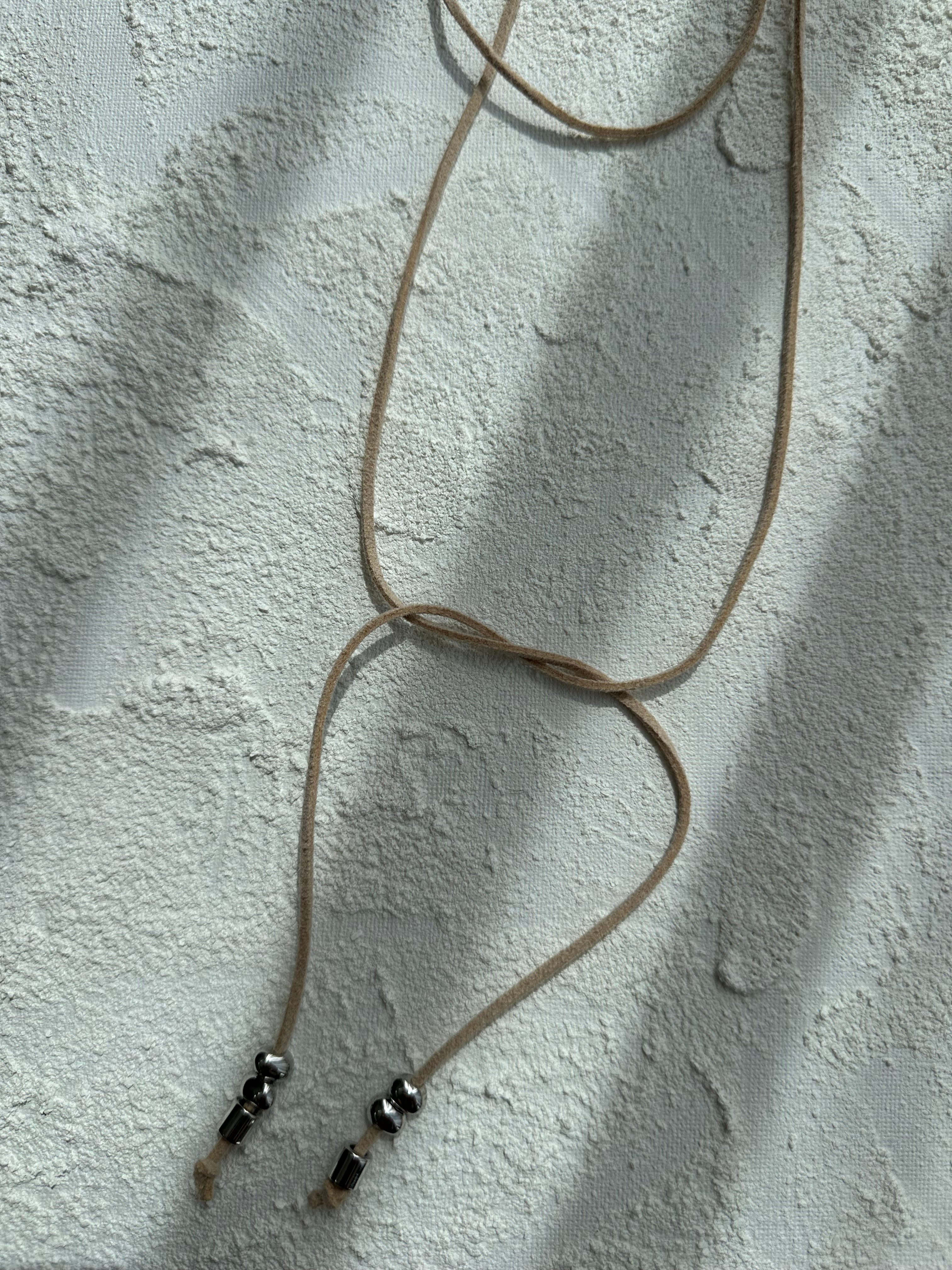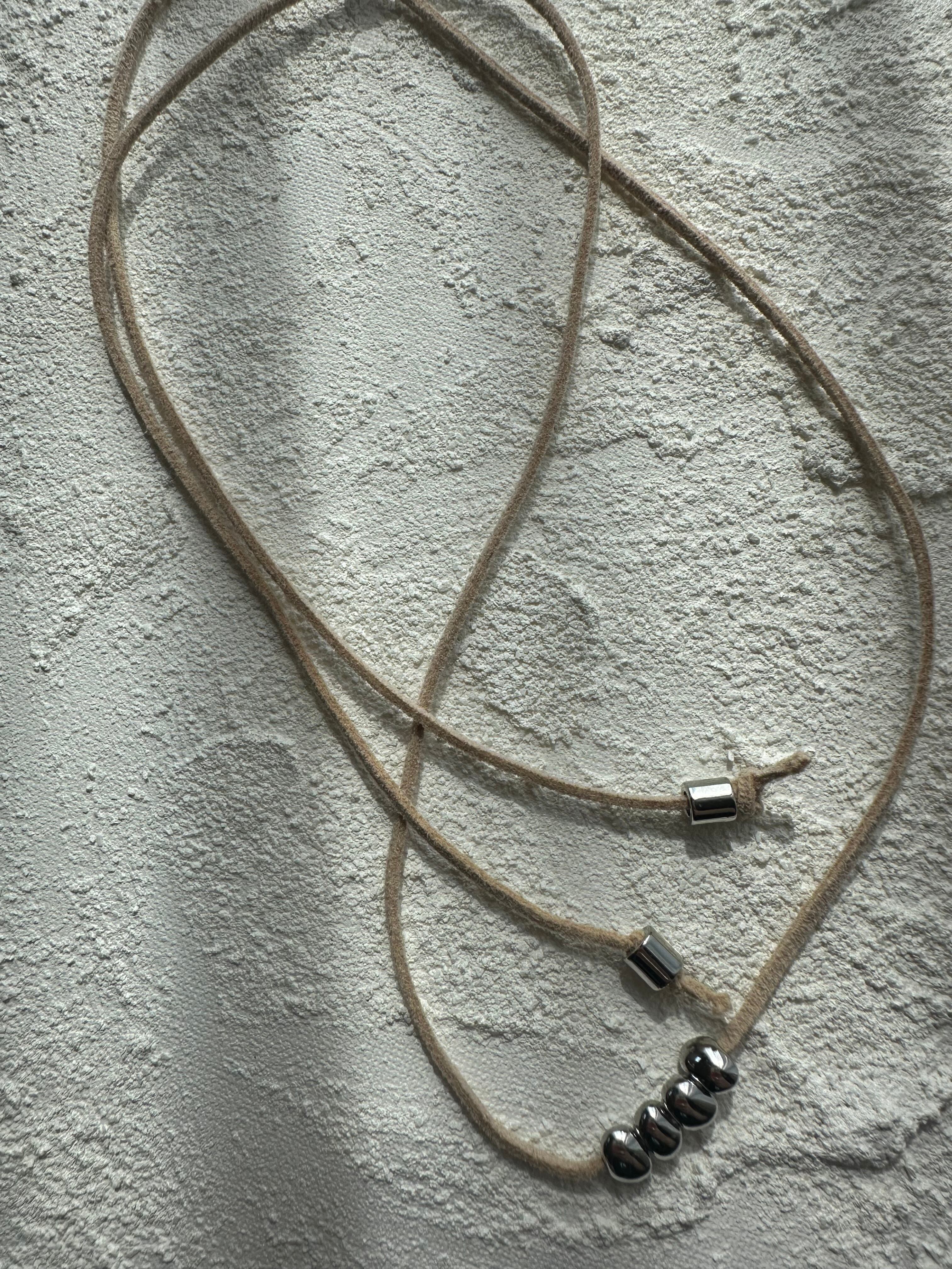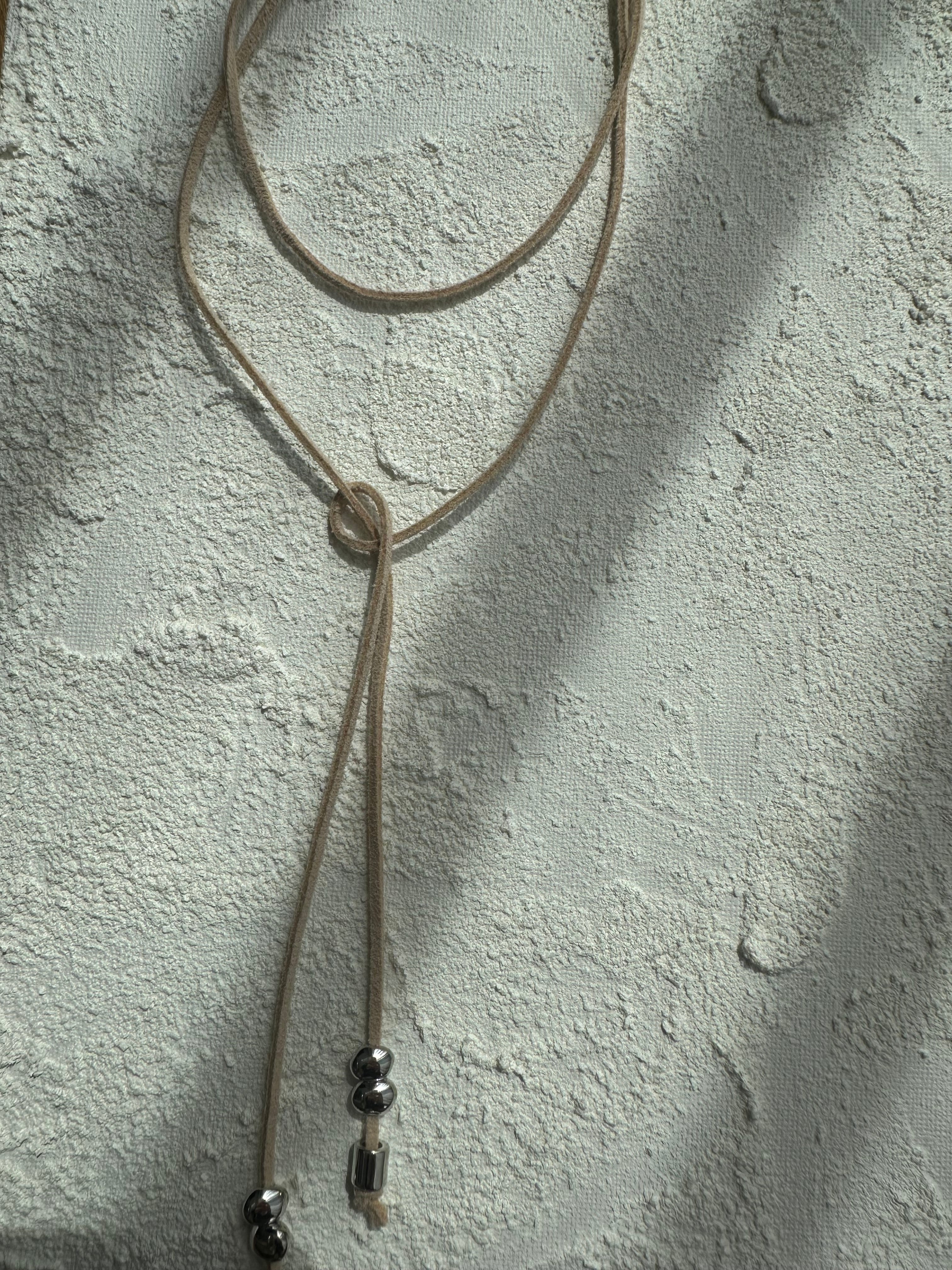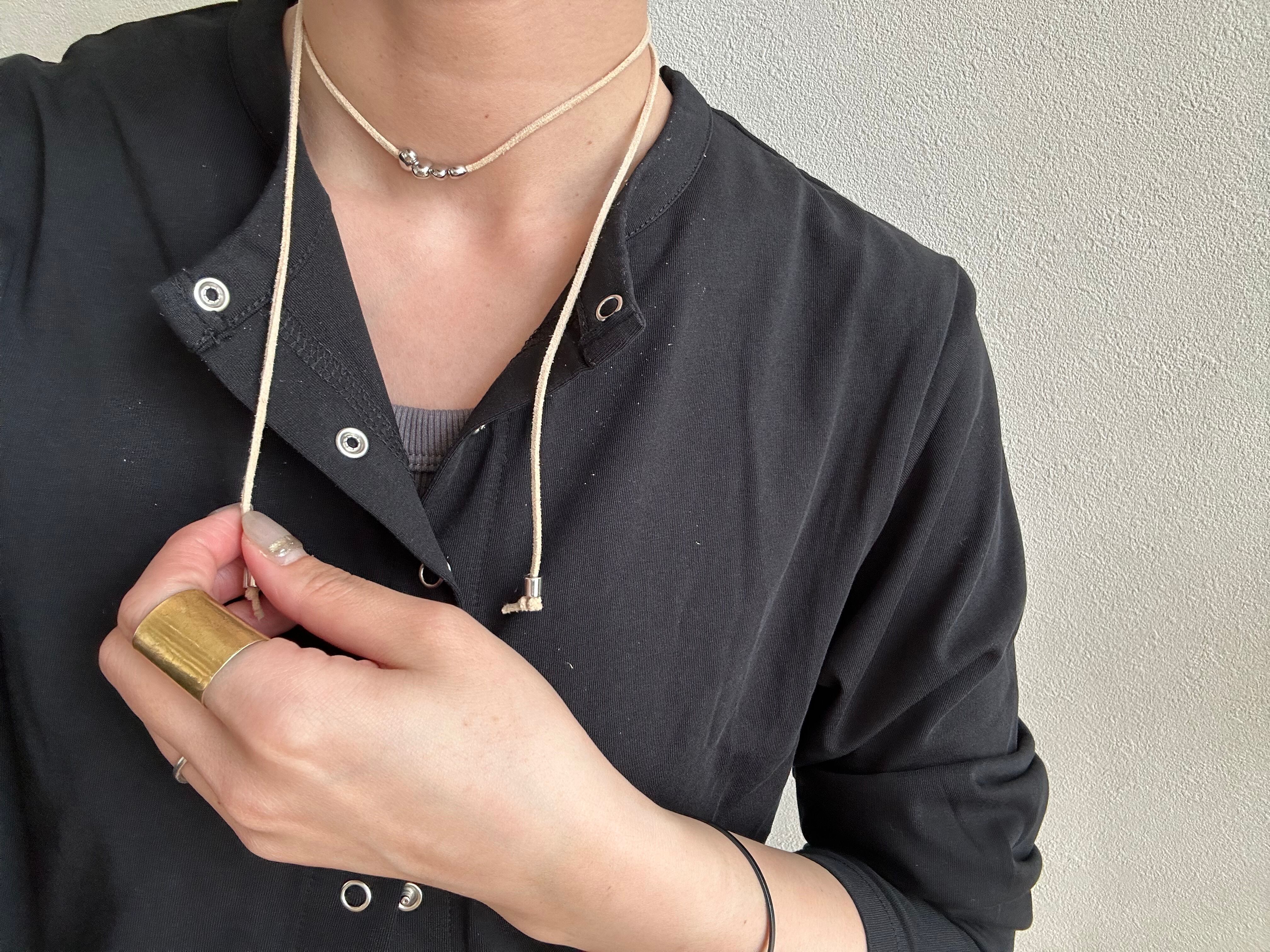 ご自身で結び目を変えて頂ける自由度の高いデザインで、首元にラフに巻き付けて頂いたり、バックでリボン結びにして頂いたりと その日の気分やスタイルでお楽しみ頂けます。シンプルなモチーフで飽きの来ないアイテムです