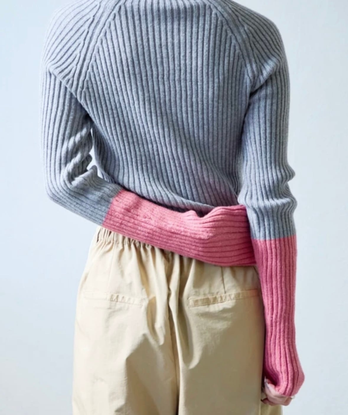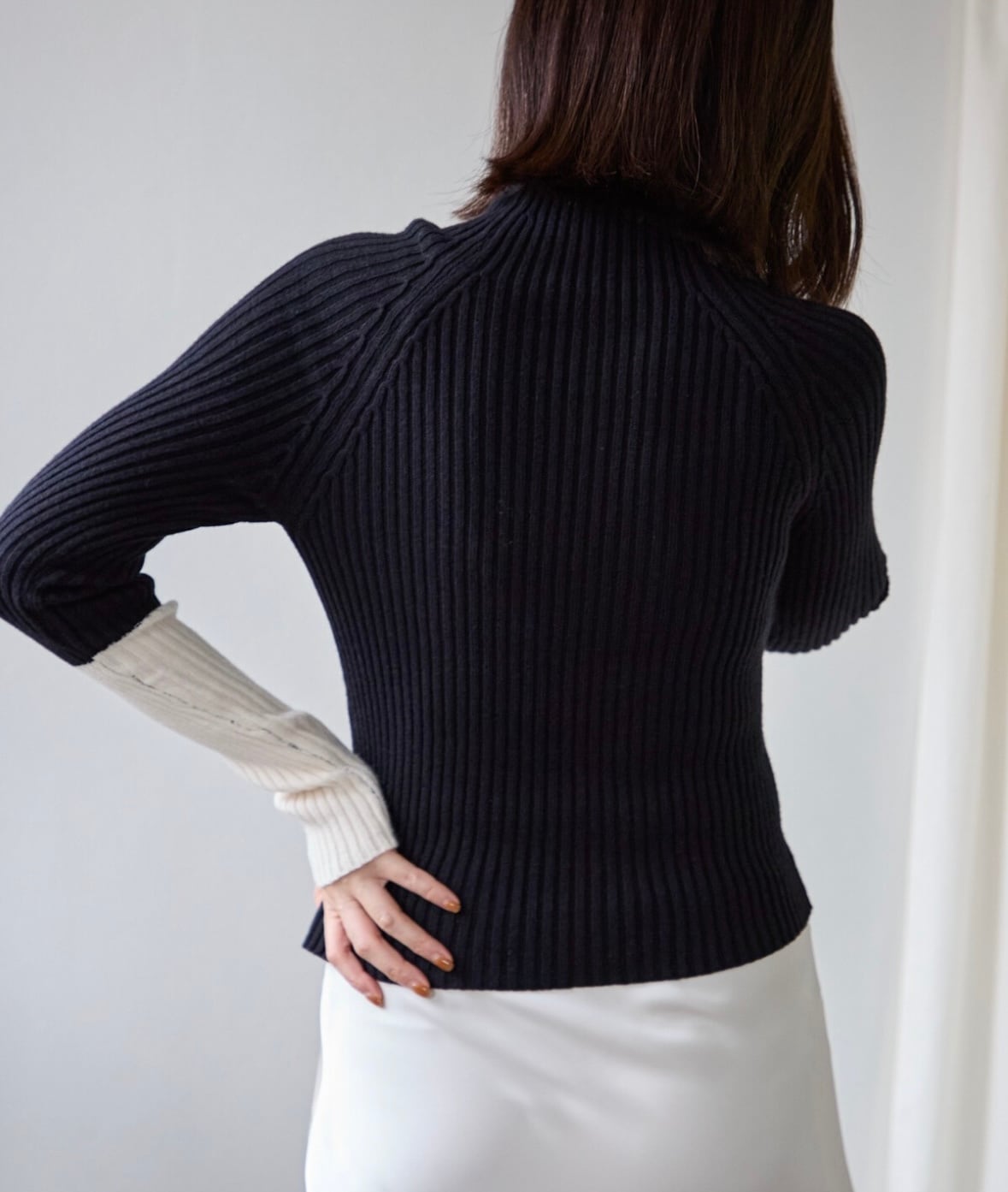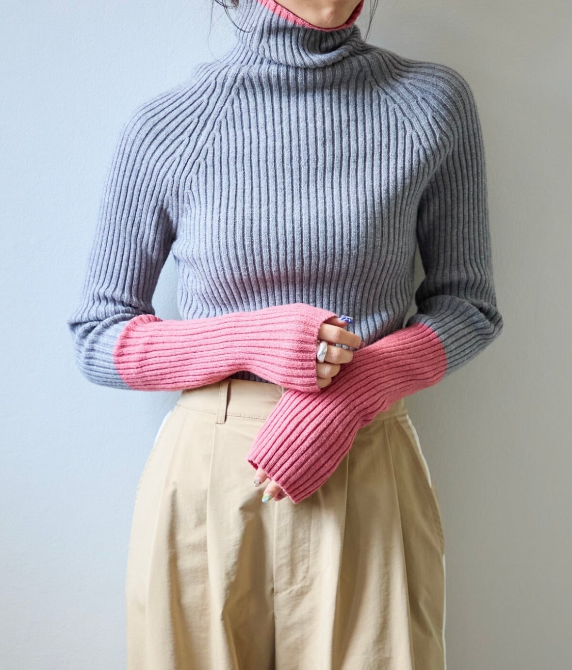 程よいフィット感が女性らしい定番のリブニットに配色デザインをプラスしました。